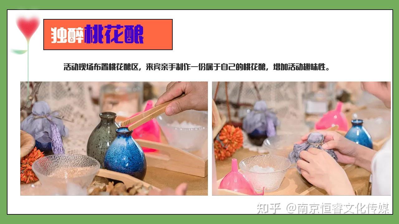 獨醉桃花釀:活動現(xiàn)場布置桃花釀區(qū),來賓可以親手制作屬于自己的桃花釀。桃花的芬芳融入美酒之中,光是想想就很美好。在制作過程中,大家既能體驗到動手的樂趣,又能感受傳統(tǒng)文化的魅力,最后還能收獲一瓶獨一無二的桃花釀。